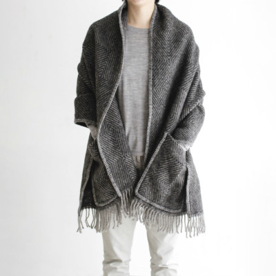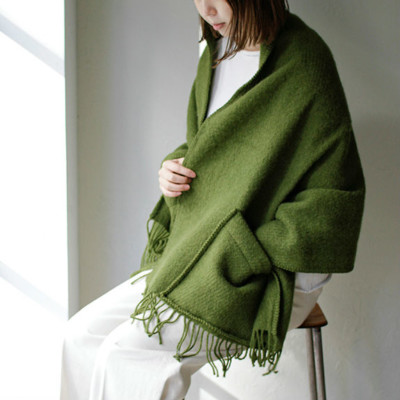 ウール100%を使用し、羽織るとその軽さと暖かさに驚かされます。お部屋の中 で羽織ったりひざ掛けとして使う事はもちろん、大きなポケットにお財布や鍵、スマートフォンを入れてちょっ とした外出や、アウター代わりに使ったりと 1 枚あると肌寒くなる秋口から春先まで重宝します。
